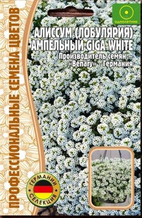 Алиссум Giga White - превосходный однолетний гибрид ампельного типа.Растение компактное, высотой 15-25 см, в поперечнике до 30-35 см, образует сплошной цветущий шар. Плети, покрытые крупными ароматными соцветиями белой окраски. Сорт отличается выносливостью и устойчивостью к пониженным температурам.