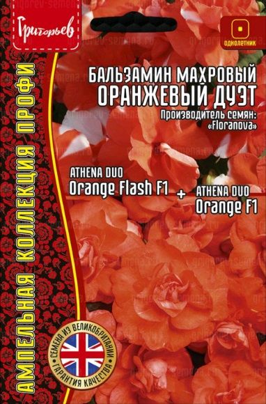 В данный оранжевый дуэт входят сорта Athena Orange F1 и Orange Flash F1! Серия Athena – роскошная форма бальзамина для подвесных корзин и вазонов образующая роскошный, цветущий шар. Многочисленные полумахровые или махровые цветки (4-5 см в диаметре) никого не оставят равнодушными. Растение сильно ветвится, формирует побеги длиной 30-35 см. Серия прекрасно подходит для сада и контейнерной культуры. Посадки можно разместить даже в довольно густой полутени, так как растения нетребовательны к освещению. В таких условиях окраска цветков обычно бывает ярче, чем на солнце. Не рекомендуется сажать в ветреных местах. Непрерывное цветение с июня до заморозков.