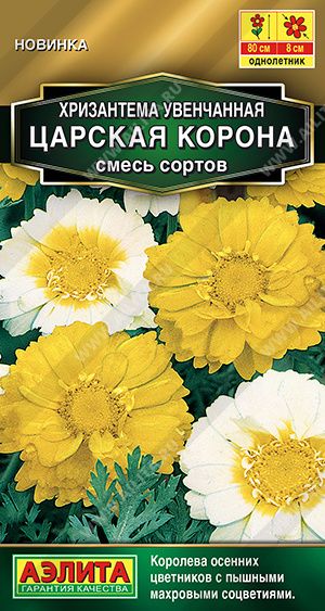 Хризантема увенчанная – королева осенних цветников. Неприхотливое, холодостойкое однолетнее растение, цветет долго и обильно. Формирует пышные и сильноветвистые кустики, высотой 70-80 см. Соцветия махровые и полумахровые, ? 7-8 см, окружены декоративной кружевной листвой. Смесь прекрасно подойдет для оформления клумб, рабаток и сборных цветников. Молодые листья хризантемы можно использовать в кулинарии для добавления в салаты и украшения блюд.