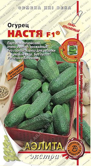 Очень ранний самоопыляемый партенокарпический гибрид для открытого грунта, пленочных и стеклянных теплиц. Отличительные свойства: увеличенный период плодоношения, высокая урожайность и товарность плодов. Устойчив к основным болезням огурца: вирусу огуречной мозаики, настоящей мучнистой росе, оливковой пятнистости, толерантен к ложной мучнистой росе. Растение среднеплетистое. Зеленец крепкий, хрустящий, мелко-бугорчатый, с белым, плотным опушением, овально-цилиндрический, ярко-зелёный. Масса зеленца 80-86 г, длина 6,0-8,0 см, соотношение длины к диаметру 3,0:1. Не содержит горечи. Отличные вкусовые качества в свежем виде, при консервировании и засолке. Компания «АЭЛИТА» является эксклюзивным продавцом гибрида огурца «Настя F1»® на рынке семян.