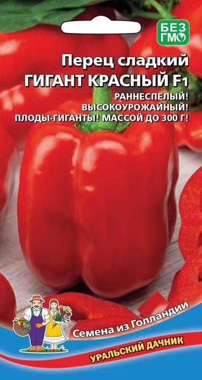 Раннеспелый гибрид для выращивания в открытом грунте и в теплицах. Растение, высотой до 1 метра, буквально усыпано плодами-гигантами массой до 300 г. Гигант красный F1— один из самых толстостенных среди сладких перцев. Толщина стенки — до 1,2 см. Универсальное использование.