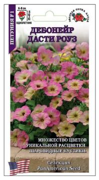 Серия Дебонейр объединяет петунии с уникальными расцветками цветов, сильным ростом и способностью формировать шарообразную форму куста. Растения очень плотные, высотой 25-40 см и диаметром 25-30 см, усыпанные многочисленными цветками нежного розового цвета с желтоватой серединкой. Из-за неравномерности окрашивания, на одном кусту могут встречаться цветки двухцветной окраски и однотонной, различных оттенков розового и желтого. Петунии серии Дебонейр предназначены для вазонов, балконных ящиков и для декорации изысканных клумб.