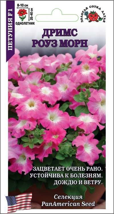 Петунии серии Дримс отличаются очень ранним и обильным цветением, устойчивы к неблагоприятным погодным условиям и болезням. Растение крепкое, компактное, ветвистое, прекрасно разрастается и замечательно восстанавливается после дождя и ветра. Крупные воронковидные цветки ярко-розового цвета с бело-желтой серединой привносят неповторимое очарование в цветники, вазоны и ящики.
