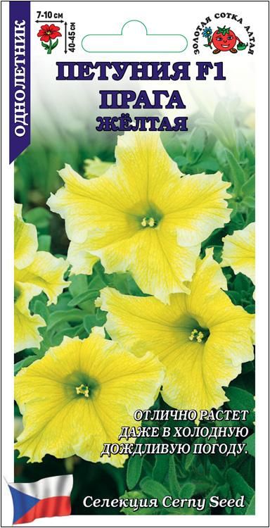 Петунии серии «Прага» отлично растут не только в теплые солнечные дни, но и дают хороший результат при холодной дождливой погоде, обильно цветут до глубоких заморозков. Растения высотой 30-35 см, компактные, хорошо ветвятся. Крупные воронковидные цветы окрашены в довольно редкий для петуний интенсивно-желтый цвет. Используют для украшения различных цветников, высаживают в вазоны, кашпо и ящики