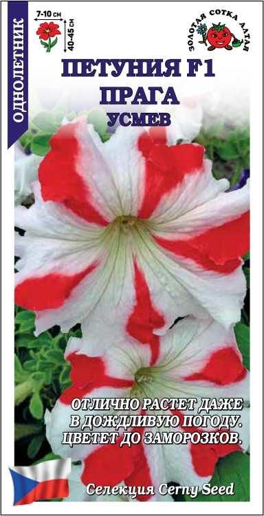 Петунии серии «Прага» устойчивы к неблагоприятным условиям, отлично растут и цветут даже при холодной дождливой погоде. Сильно ветвящееся от основания растение усыпано крупными воронковидными цветами красно-белого цвета. Гибрид великолепно подходит для украшения клумб, рабаток и бордюров, отлично смотрится в вазонах, кашпо, балконных и оконных ящиках. Цветет обильно до глубоких заморозков.